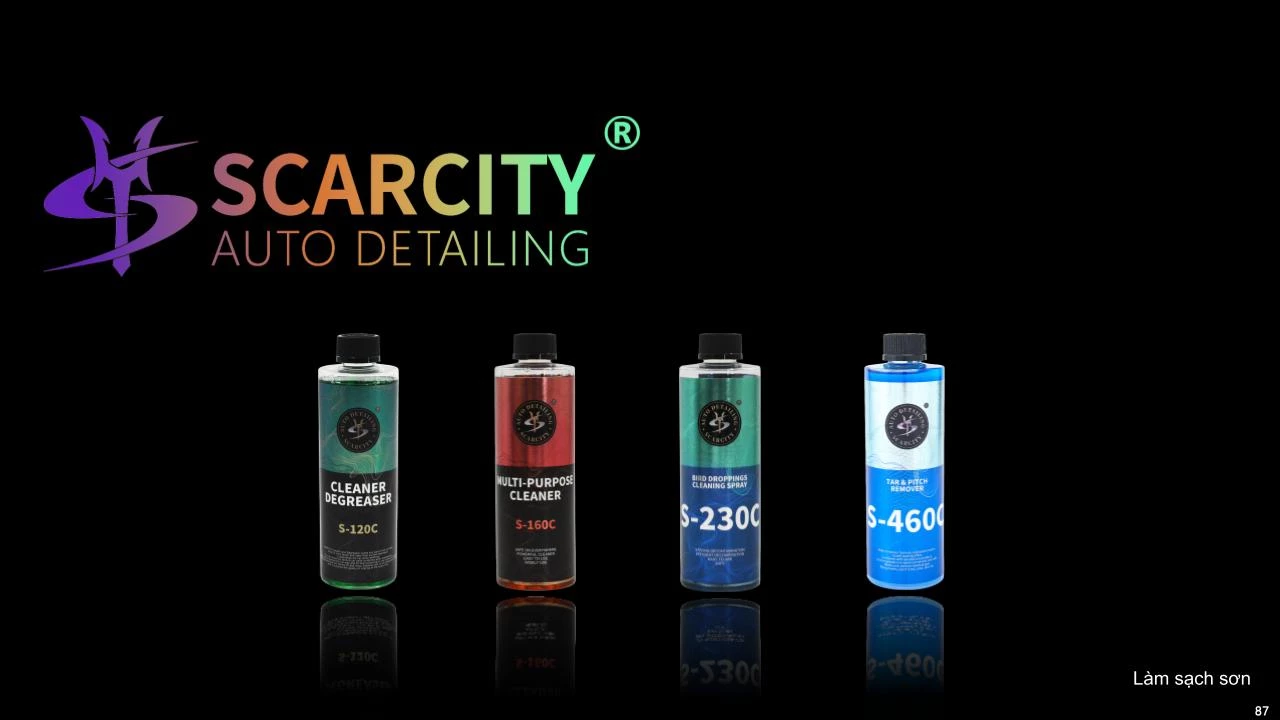 Ngoài ra, SCARCITY còn cung cấp các sản phẩm xử lý sơn như clay bar, dung dịch tẩy sắt, hợp chất đánh bóng gốc nước và dung dịch tẩy vết dầu chiết xuất từ cam quýt, giúp tối ưu hiệu quả làm sạch và bảo dưỡng xe.